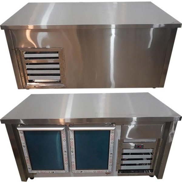 یخچال رویه میزکار تمام استیل بوده به طوریکه سطح بالای میز با ورق استیل خشدار بضخامت ۰/۸ میلیمتر و کناره های آن باورق استیل بضخامت ۰/۷ میلیمترساخته شده است.